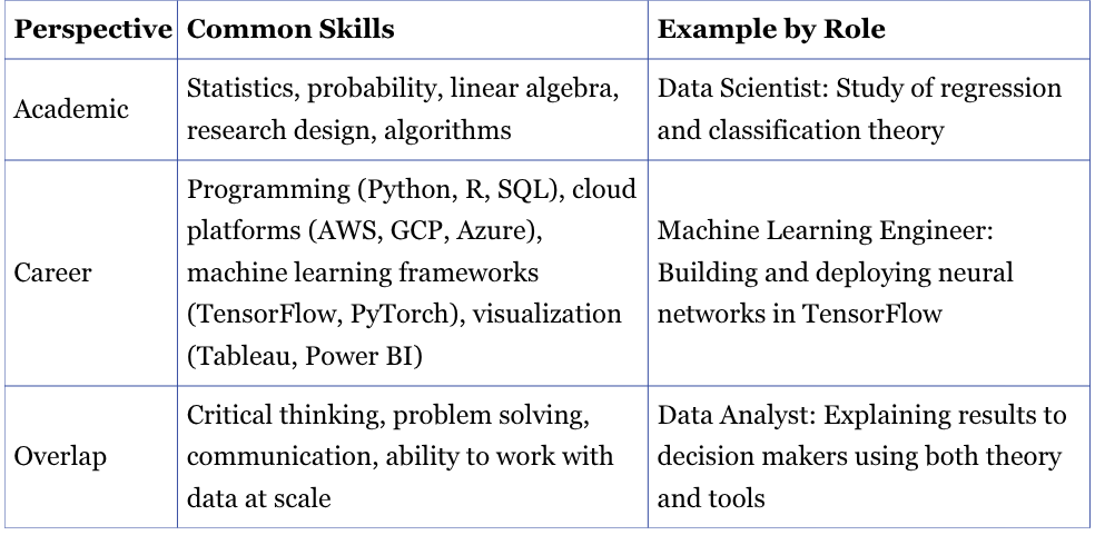 For example, an academic focus might be learning the math behind a regression model. A career focus might be building that model in Python and deploying it with scikit-learn. A Data Engineer may study database theory in school but later use SQL and cloud services like AWS Redshift to handle live data. Both perspectives connect, but the balance shifts from “why it works” to “how it works in practice.”