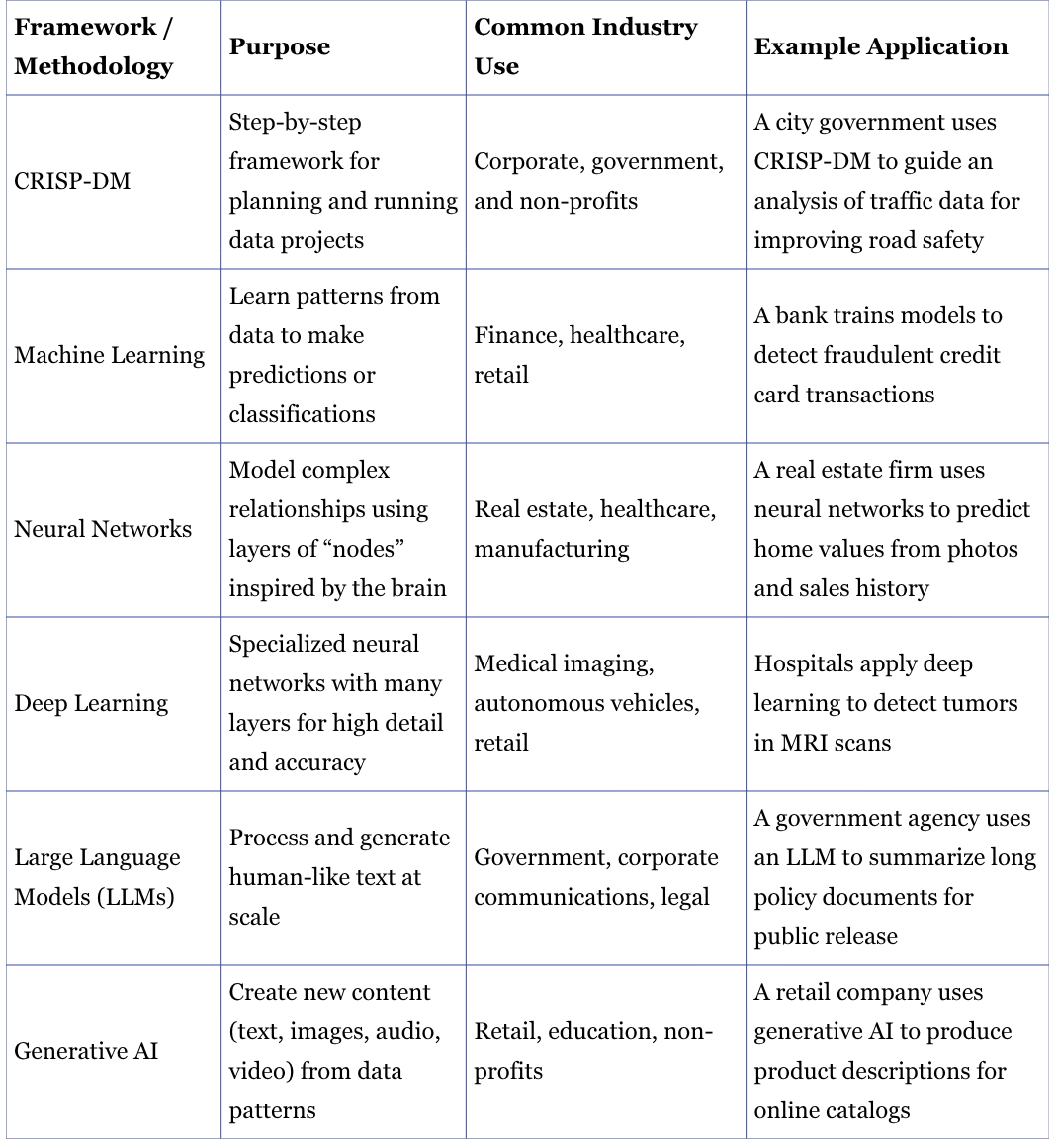 These approaches all fit within data science and AI but serve different roles. CRISP-DM provides a structured project roadmap, while the others focus on building or training models that learn, predict, or create. Some emphasize process; others emphasize intelligent automation.