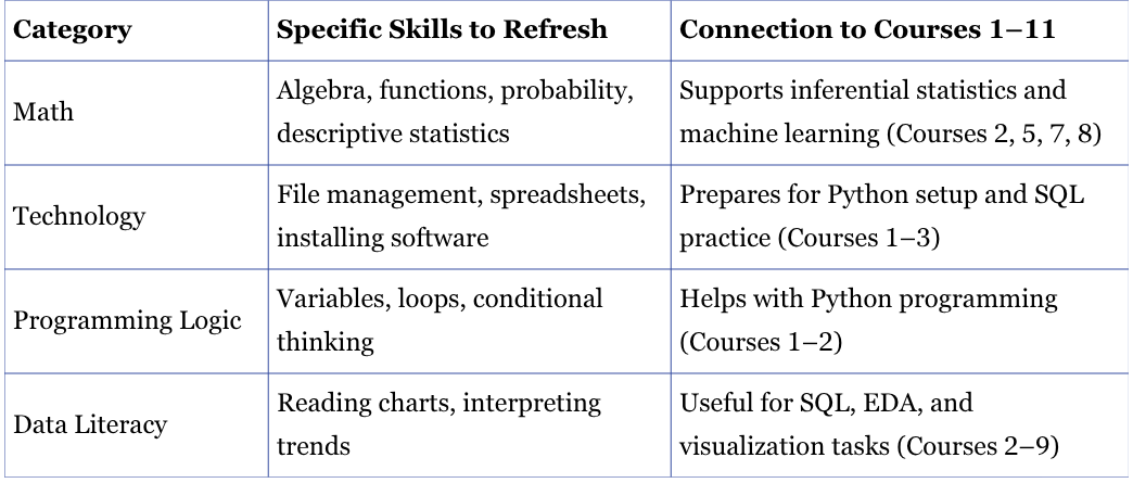 Before starting an AI-focused track, it’s helpful to have a solid technical foundation and refresh key math and computing skills. This preparation makes advanced topics like machine learning, neural networks, and large language models easier to master.