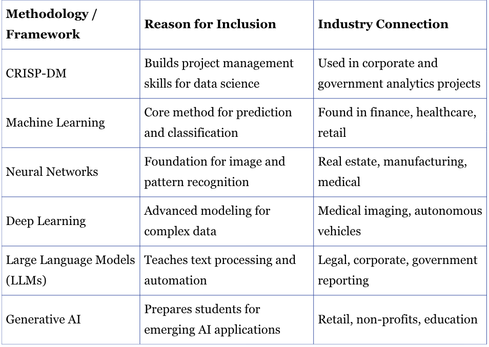 Each of the frameworks and methods (see charts above) was chosen because it reflects both academic foundations and what employers ask for in real jobs. Together, giving learners a strong balance between theory and practice.